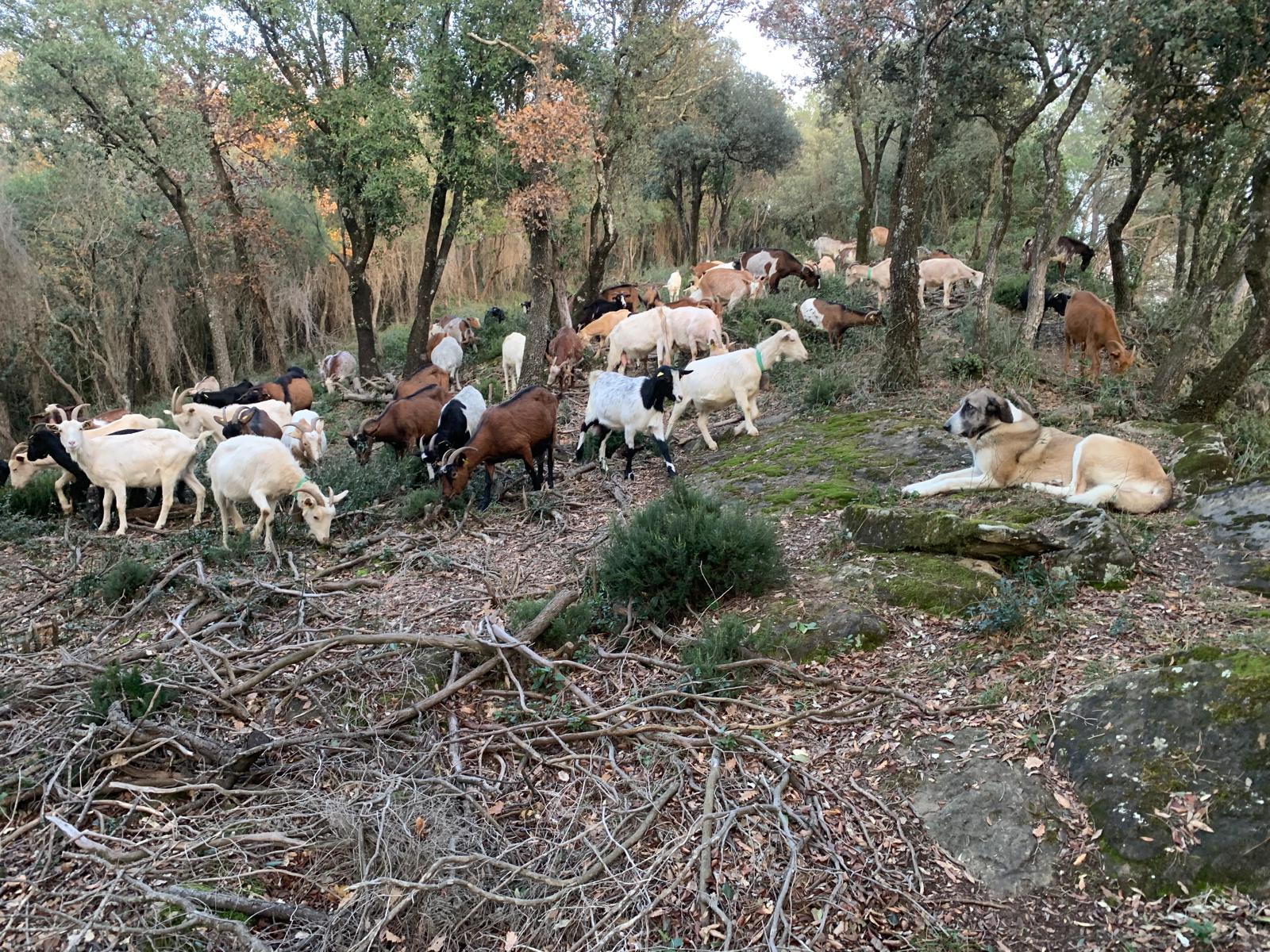 En David pastura amb el seu ramat de 90 cabres i unes 100 ovelles ripolleses per al zona de Santa Pau contribuint a reduir el risc d’incendi forestal. També ven carn de xai i cabrit i està en tràmits d’aconseguir la certificació ecològica.