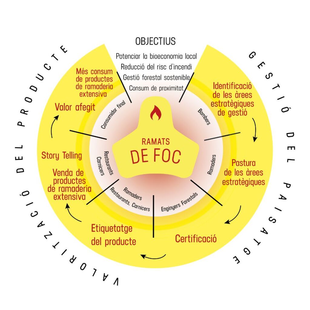 Els ramaders i ramaders que contribueixen amb la pastura del seu ramat a mantenir les zones estratègiques per a la gestió d’incendis, tenen el reconeixement a través del distintiu “Ramats de Foc” en els seus productes. L’objectiu del segell és visibilitzar la seva tasca, valorant i diferenciant els seus productes, fent partícips als consumidors finals, i compensant l’esforç i valor afegit que la seva contribució suposa.